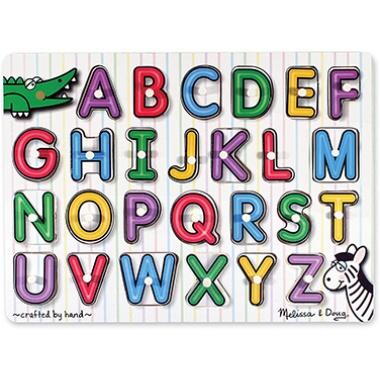 This wooden peg puzzle includes a piece for each of the 26 letters in the alphabet. A colorful picture under each piece shows an image beginning with the same letter, helping to develop letter recognition and pre-reading skills! Also encourages hand-eye, fine motor, and visual perception skills.