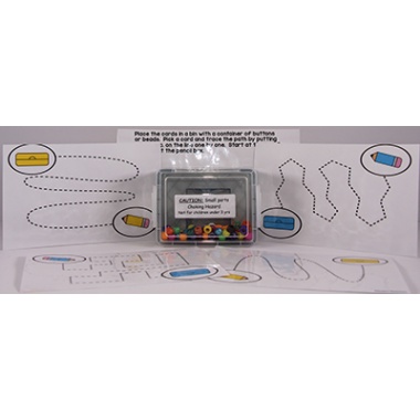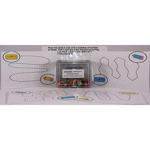 Bag contains: 4 laminated cards with various path designs, 72 beads, 1 container for beads, and laminated instructions. Activity is great for practicing pre-writing skills, fine motor, skills, hand-eye coordination, following directions